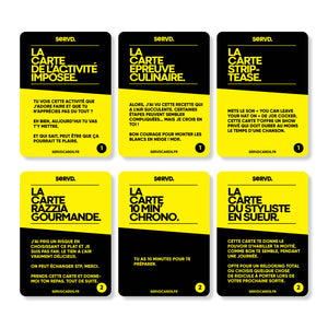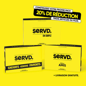 Lorsqu'il s'agit de jeux en famille ou avec votre partenaire, SERVD est unique en son genre car il transforme en jeu votre quotidien et votre relation. Il prend des scénarios du quotidien qui pourraient survenir entre vous et votre partenaire, votre famille ou vos amis, et les transforme en actions hilarantes dans un jeu de cartes.