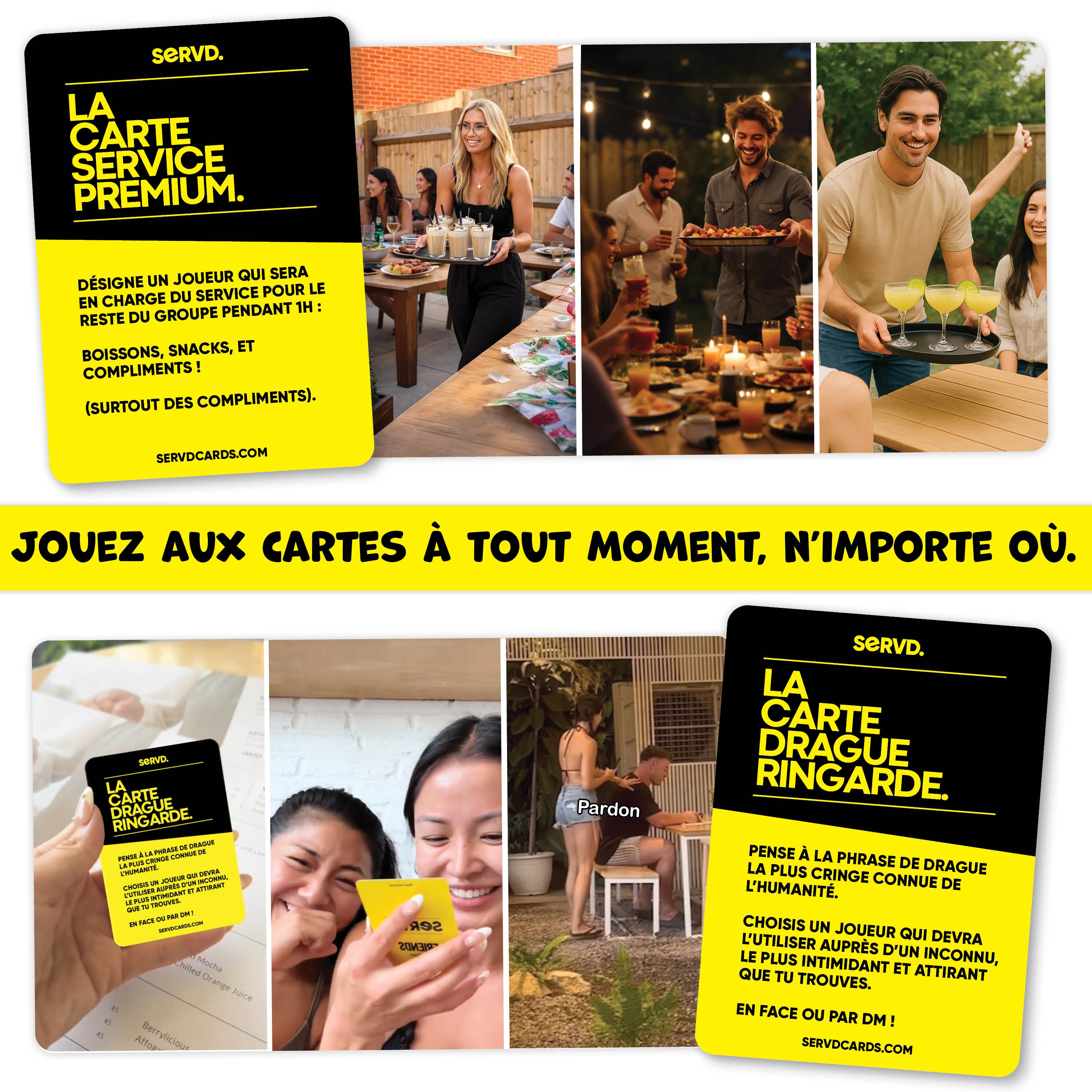 En matière de jeu de soirée, SERVD Amis est un game- changer ! Peu importe l’occasion, SERVD Amis saura ajouter du fun, du rire et de la folie avec vos amis et famille.